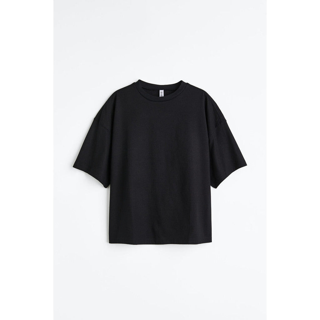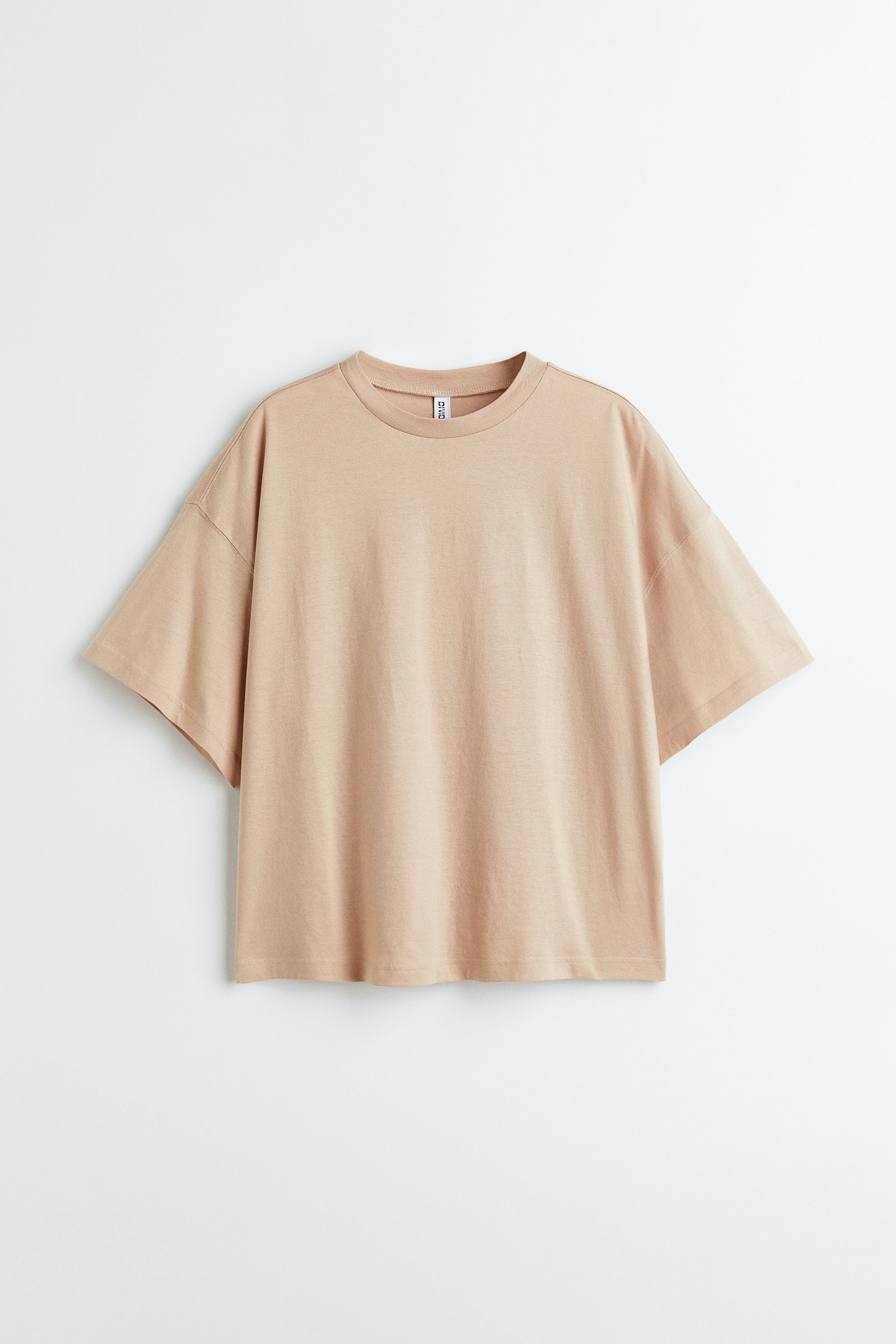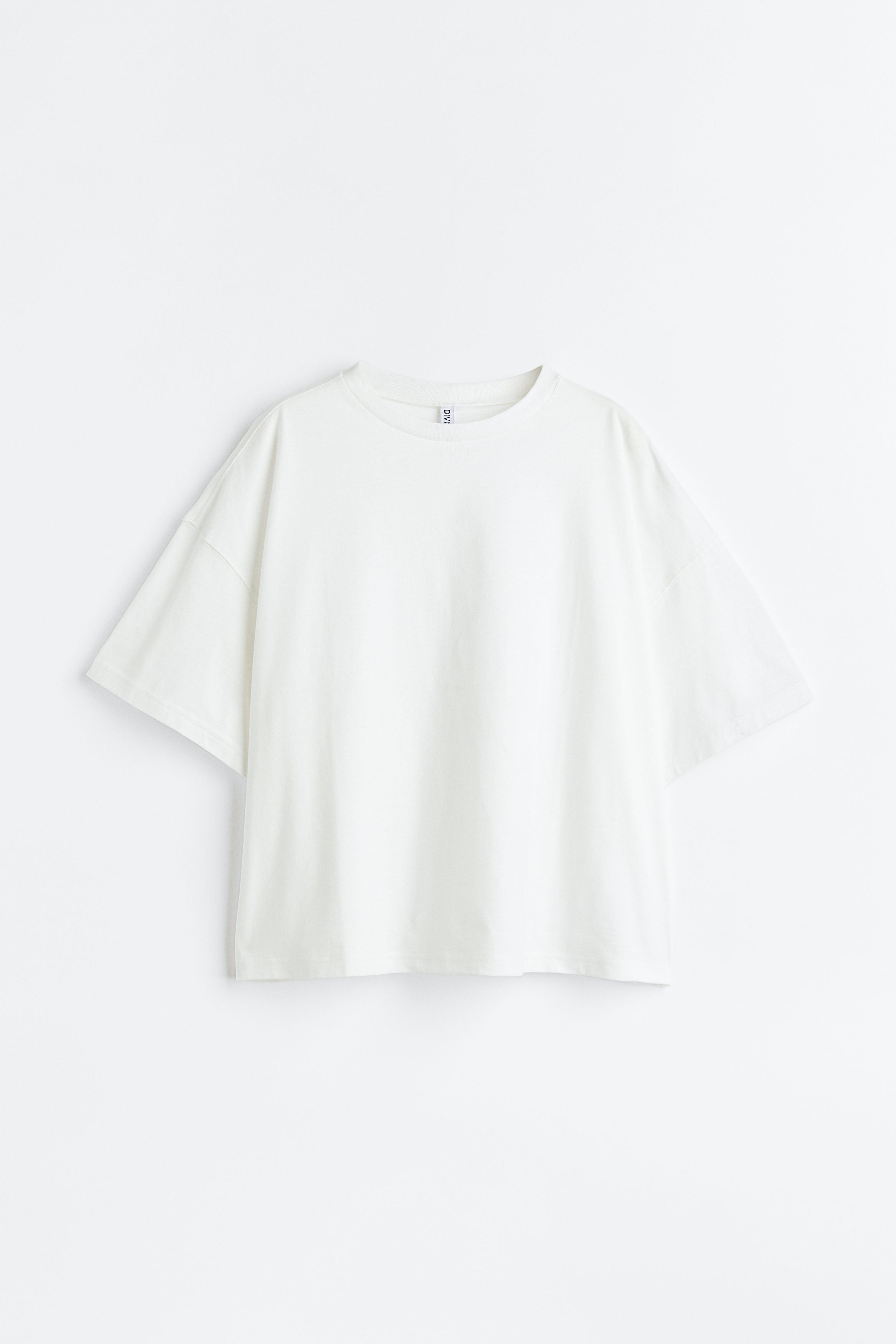 Short, oversized T-shirt in soft jersey. Boxy style with a ribbed trim around the neckline and dropped shoulders. Read more
