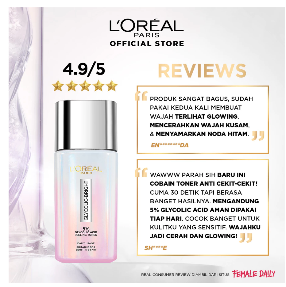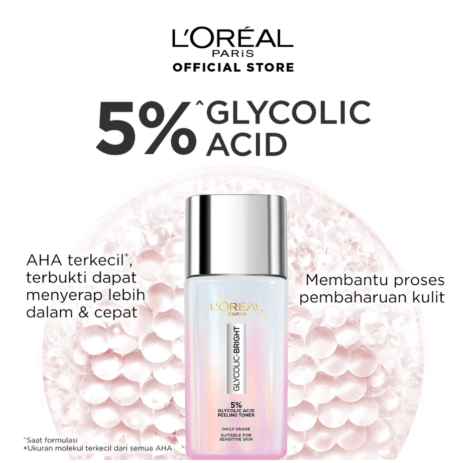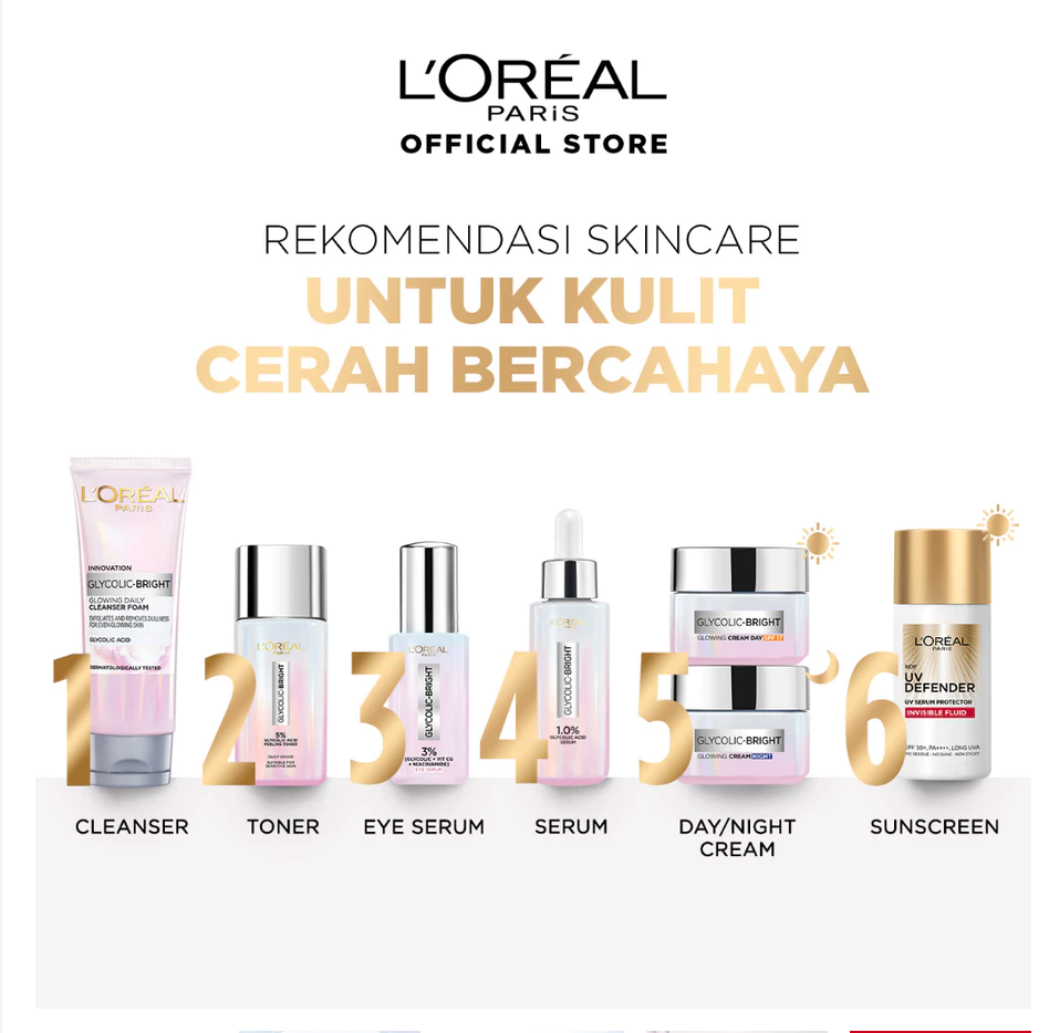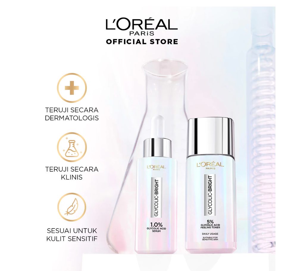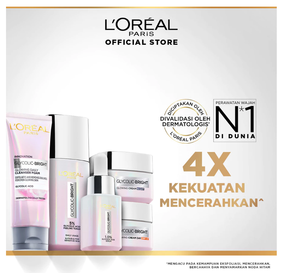L'Oreal Paris Glycolic Bright Glowing Skincare Set Mencerahkan - Facial Foam 50 ml, Toner 65ml, Serum 15ml, Day & Night Cream 15ml