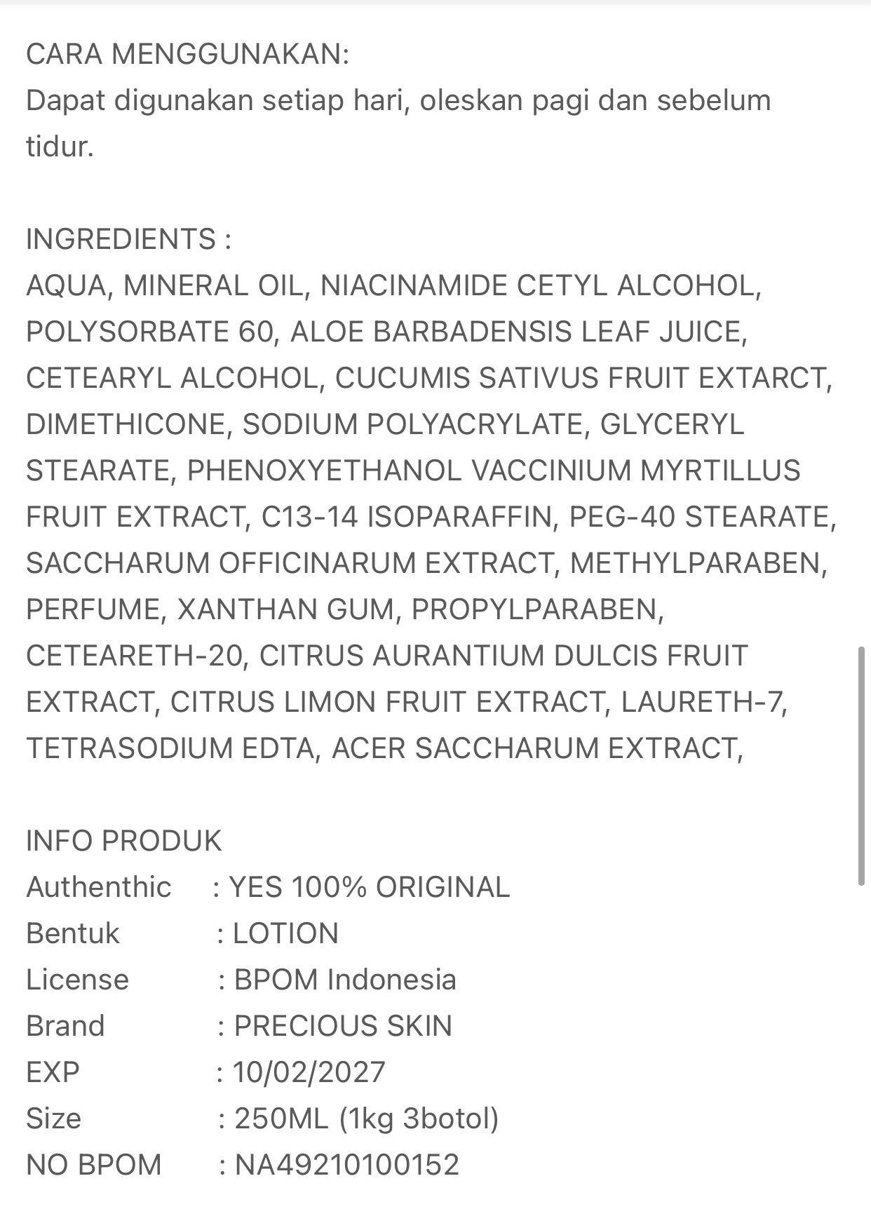 Precious Skin Thailand AHA Mimi Body Booster Extra Whtening Lotion / Bodylotion / Handbody 250ml